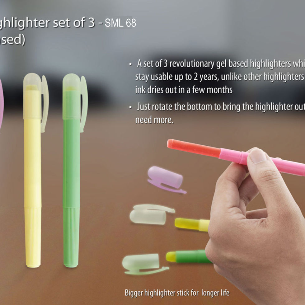 A set of 3 revolutionery gel based highlighters which will stay usable upto 2 years, unlike other highlighters whose ink dries out in a few months
