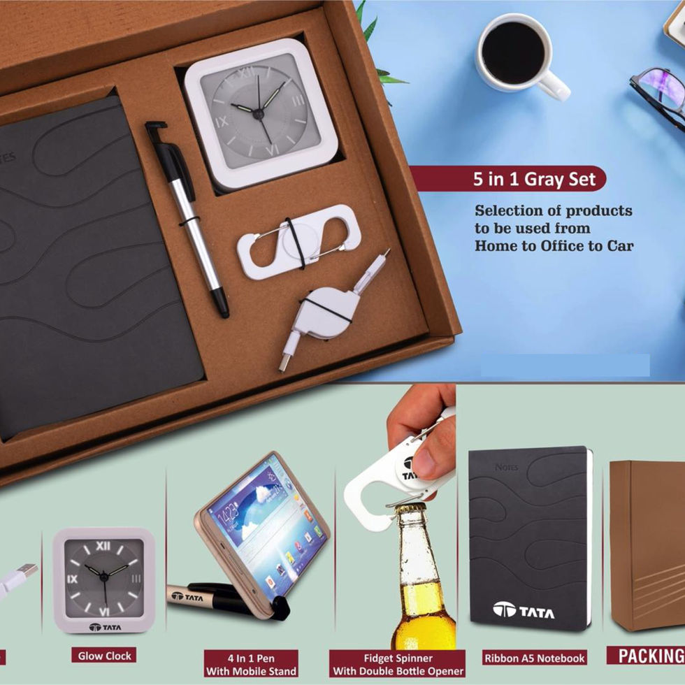 5 in 1 Gray set: Expandable Data cable, Spinner with bottle opener, 4 in 1 pen, Glow Clock and A5 PU notebook in Kraft Gift Box