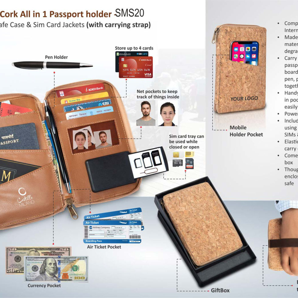 Eco-Friendly Cork All in 1 Passport holder With Sim Card Safe Case & Sim Card Jackets (with carrying strap) | Brown