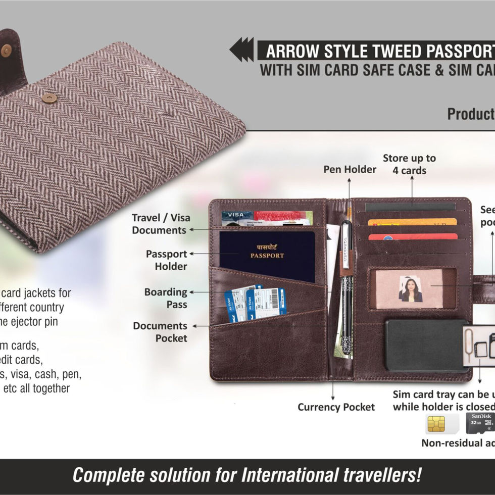 Arrow style Tweed Passport holder with Sim Card Safe Case & Sim Card Jackets | Brown